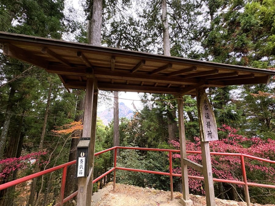 御岳山の山頂は社殿の奥にあります。階段しか登っていないのに標高929m山頂到達。その奥に「奥宮遥拝所」と言う場所があります。三角錐の山が見えて、とりあえず深く一礼。