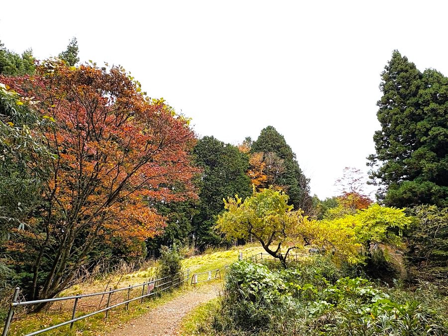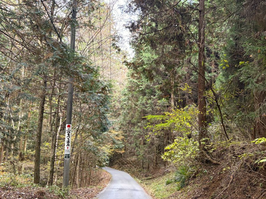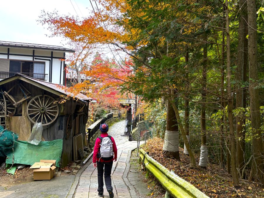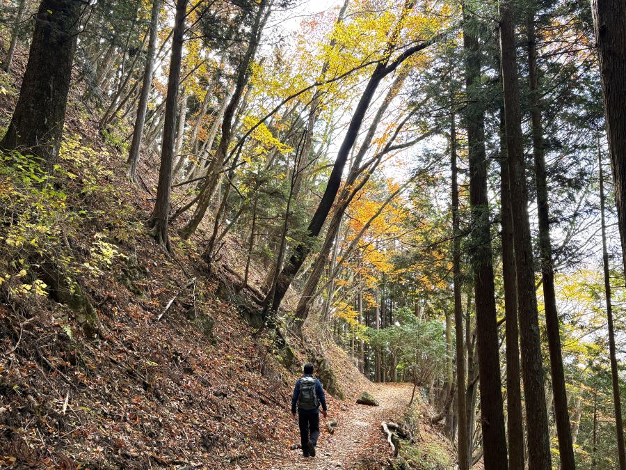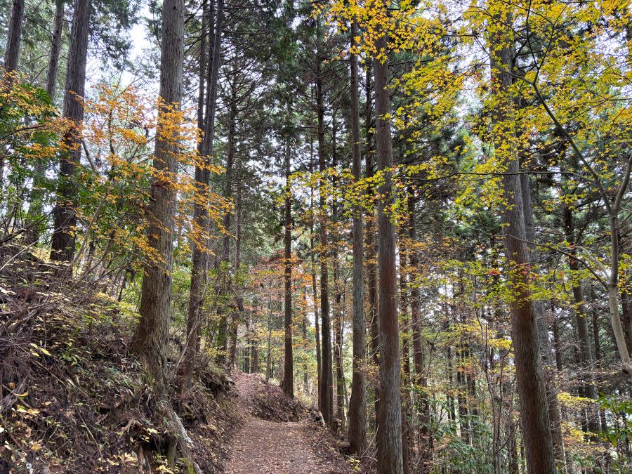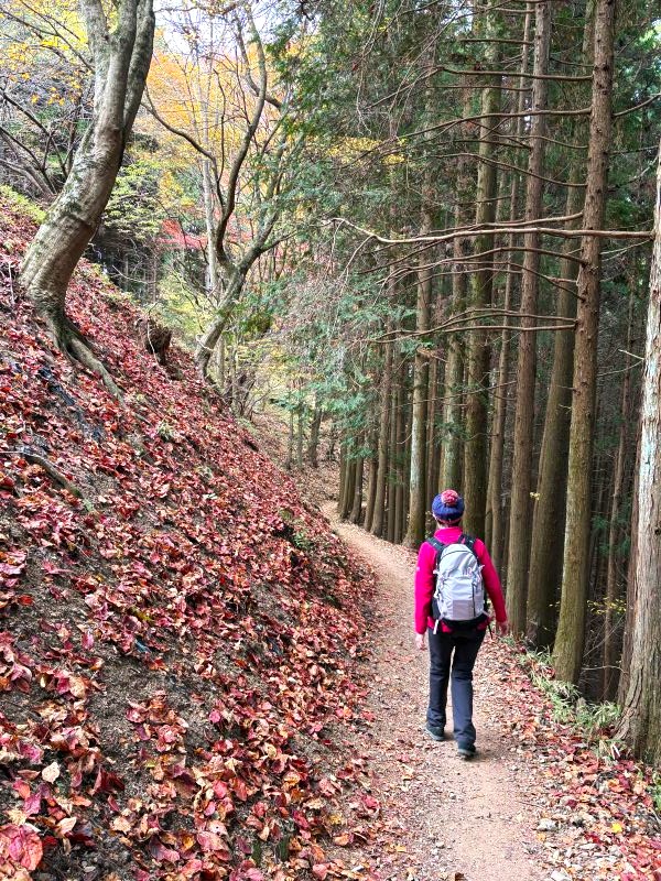 しばらくすると、家も街灯もなくなり山道が始まりますが、平坦な道で歩きやすい。斜面を紅葉した葉っぱが埋め尽くして情緒たっぷりです。