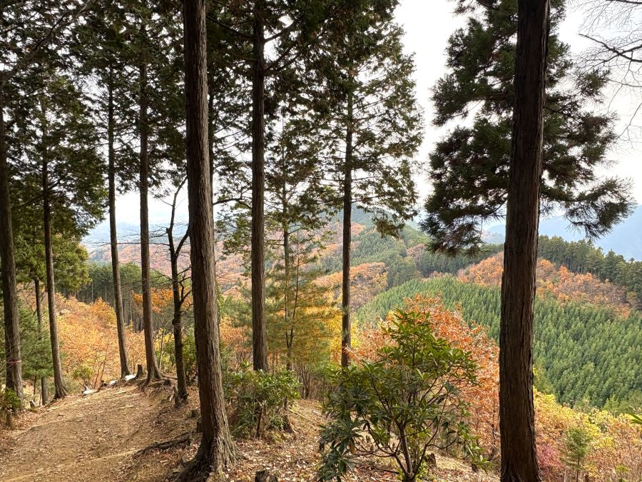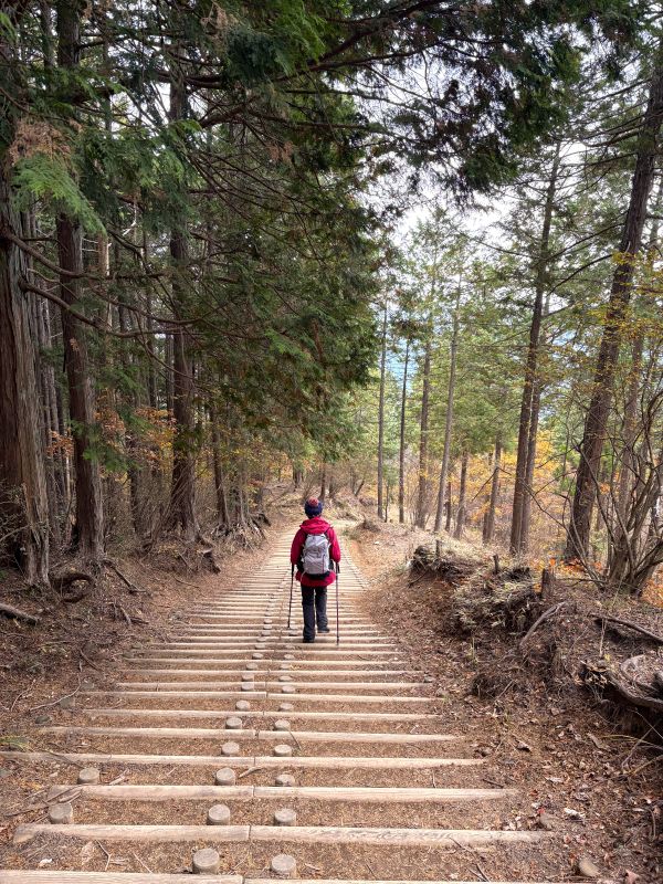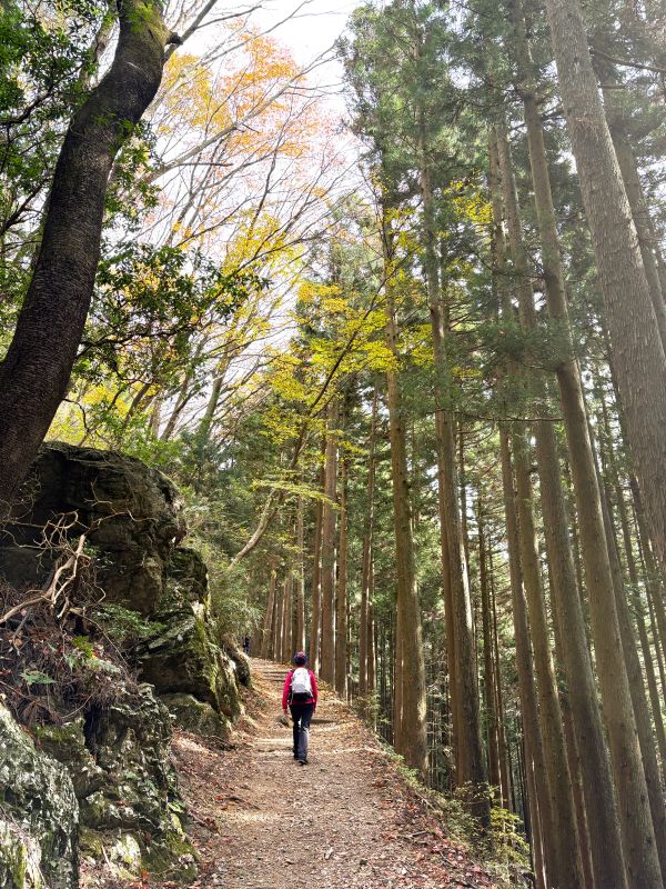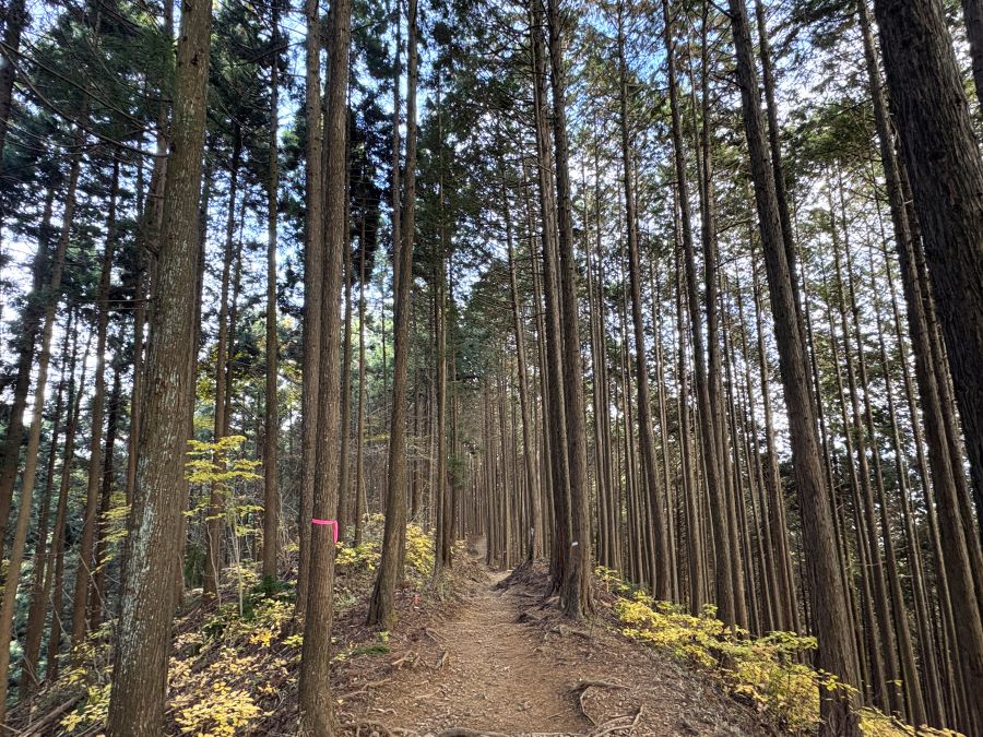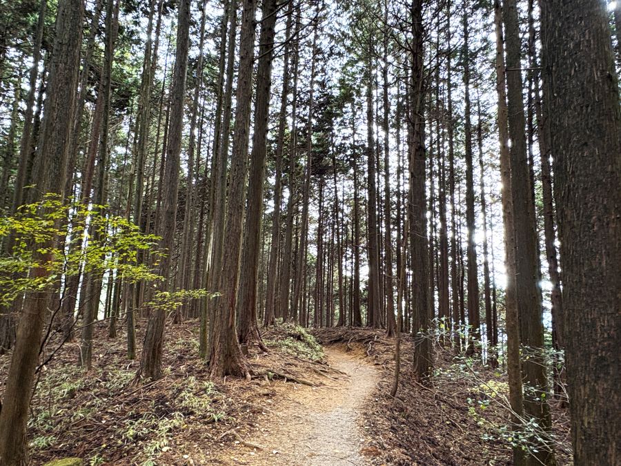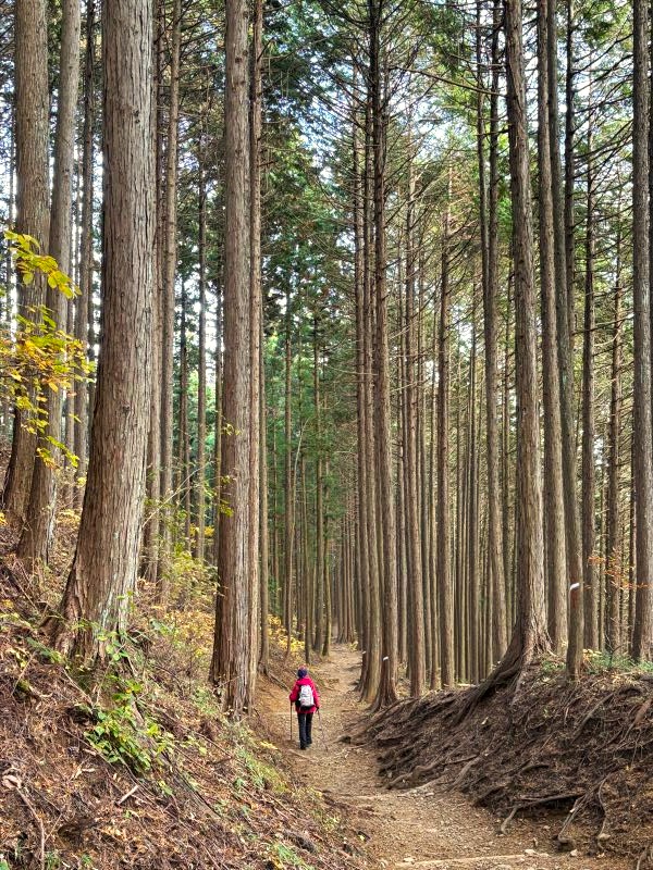 平坦な道もありますが、とはいえ標高差500m強を下らなければならないわけで、この後は杉林の中、つづら折りの下山道が続きます。膝に悪い💦