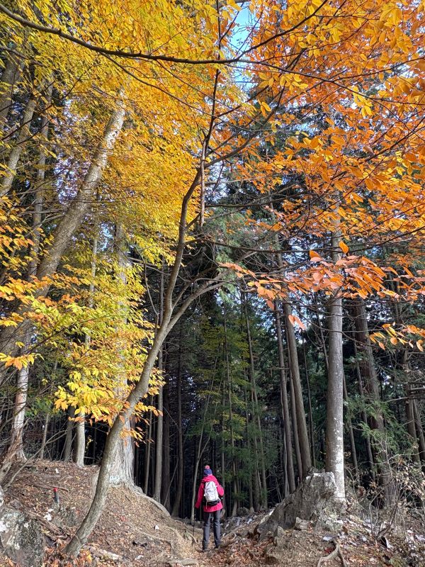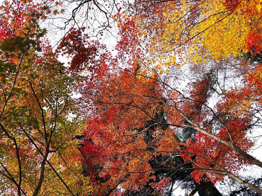 歩きながら見上げると、背の高い木々が色づいています。山の中の紅葉は降り注ぐような繊細さがあり、街中とは違う。誰かが言っていましたね💦見せるためではなく次の季節を迎えるための色なのですね。