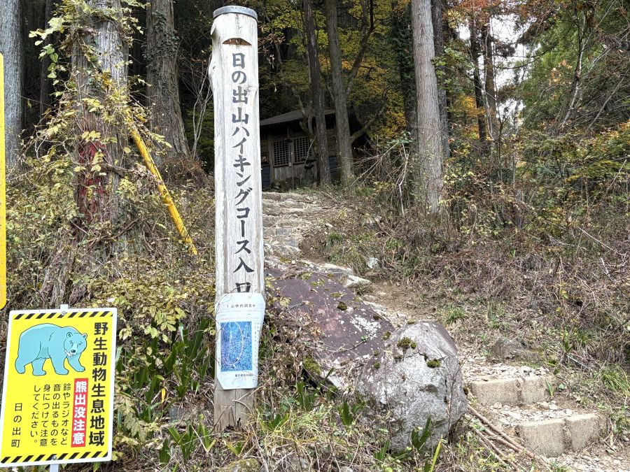 日の出山へと向かう道は、神社の境内から降りてケーブルカーの駅方面に戻ると分岐があり、ちゃんと立札があります。しばらくは宿坊の間を歩く道。途端に人通りが少なくなりました。