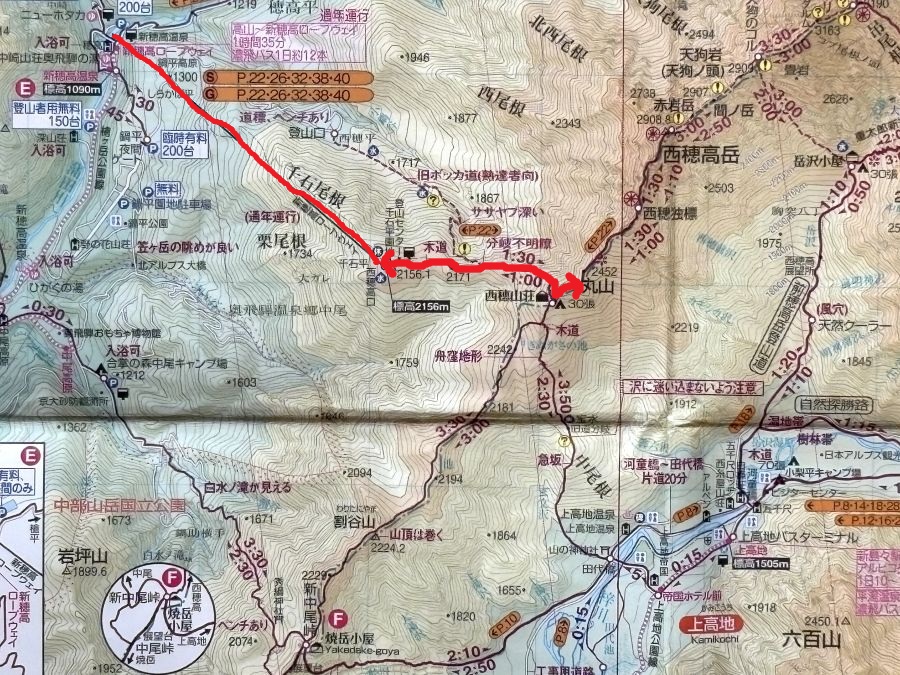 【歩いたコース】こんな感じ(下の地図↓)。なんたってロープウェイで2,156mまで楽ちん移動できるから、目的地の「西穂丸山」2,452mまでの標高差はたったの300m弱です。