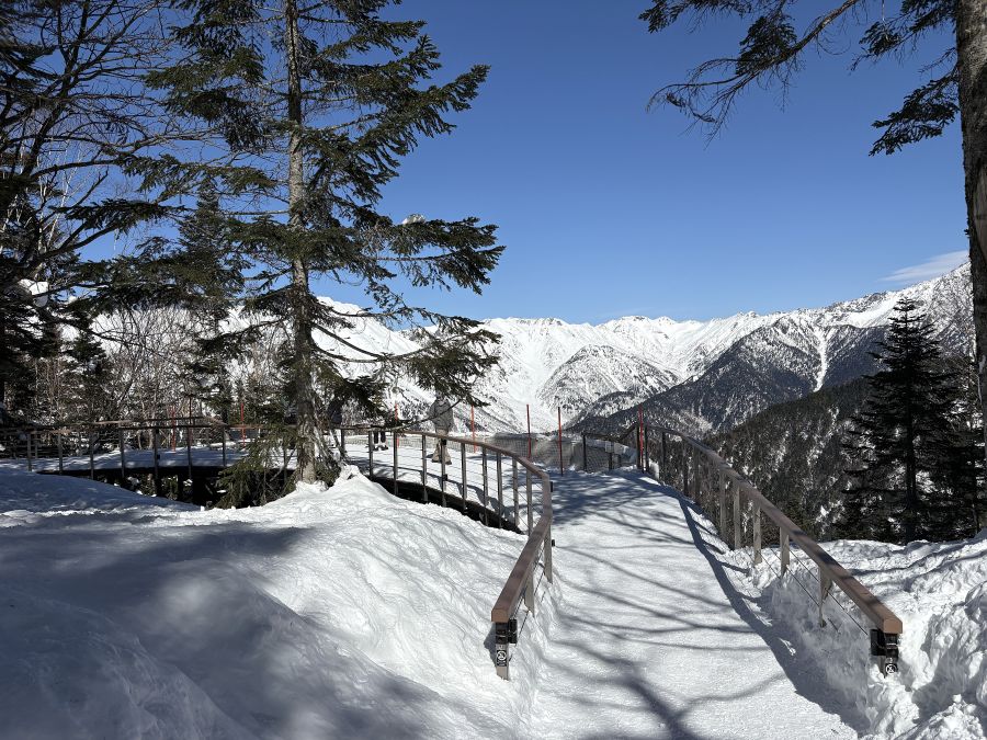 朝9時、新穂高ロープウェイ乗り場は長蛇の列でありました。どうやら登山者2割、海外からの旅行者8割という具合でしょうか。約1時間強並んでやっと乗車。第一ロープウェイで鍋平高原駅1305mへ。ここには自然散策路がありスノーシュー歩きが楽しめるみたい。