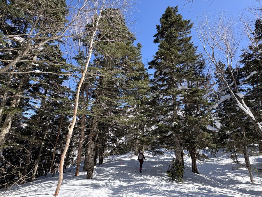 しばらくは歩きやすい雪道で、そうそう、ここ、ここよ~こんな感じが大好き!と大はしゃぎ。しかもお天気が良すぎて、ジャケットの下のフリースを脱ぎました💦