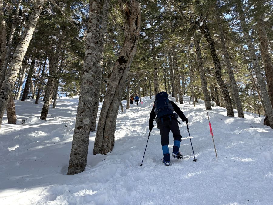 さてさて、山荘に戻って、リュックをピックアップしたら、麓の温泉をめがけて下山です。考えてみれば、昨日よっこらしょっと登った急登は下りもきつい。ですが、やっぱり雪が覆っているおかげで、膝腰負担が軽減されるみたい。慎重にアイゼンを効かせてゆっくり降りる。