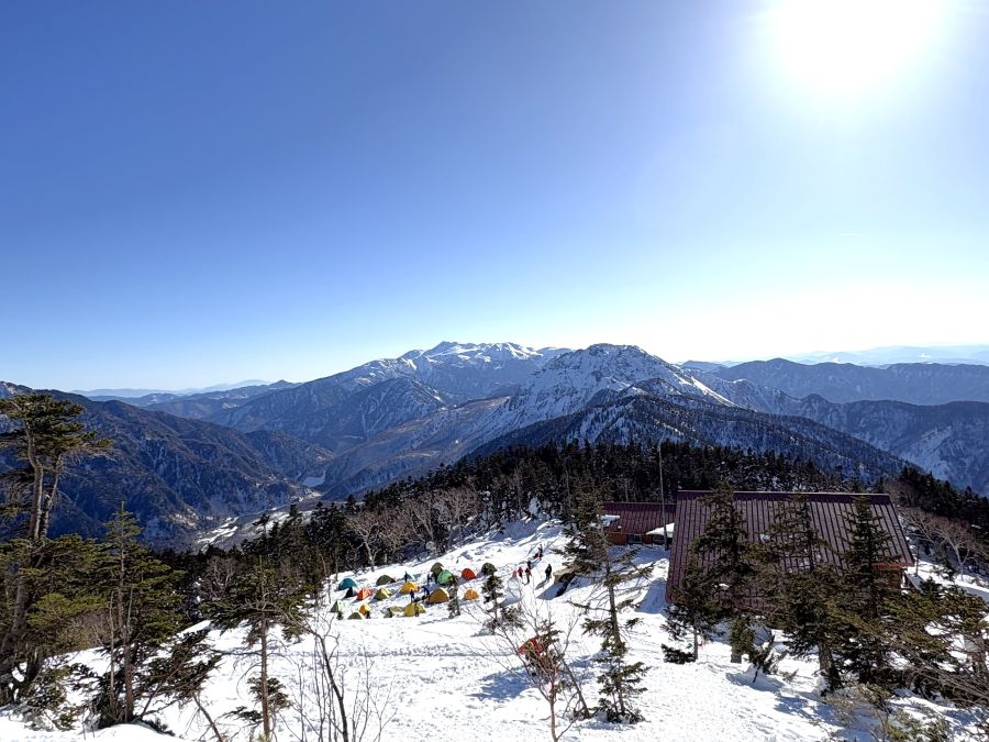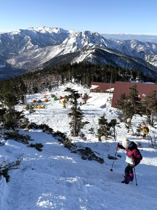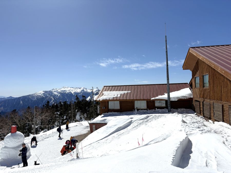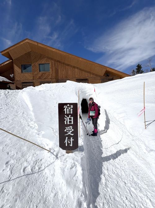 歩くこと約1時間半。あれ?もう着いた?と思うほど、あれよあれよという間に、西穂山荘到着です!すごいことに、1階は雪に覆われている。けど、雪山としてはかつて見たことないほど大勢の登山者がいらっしゃいました。