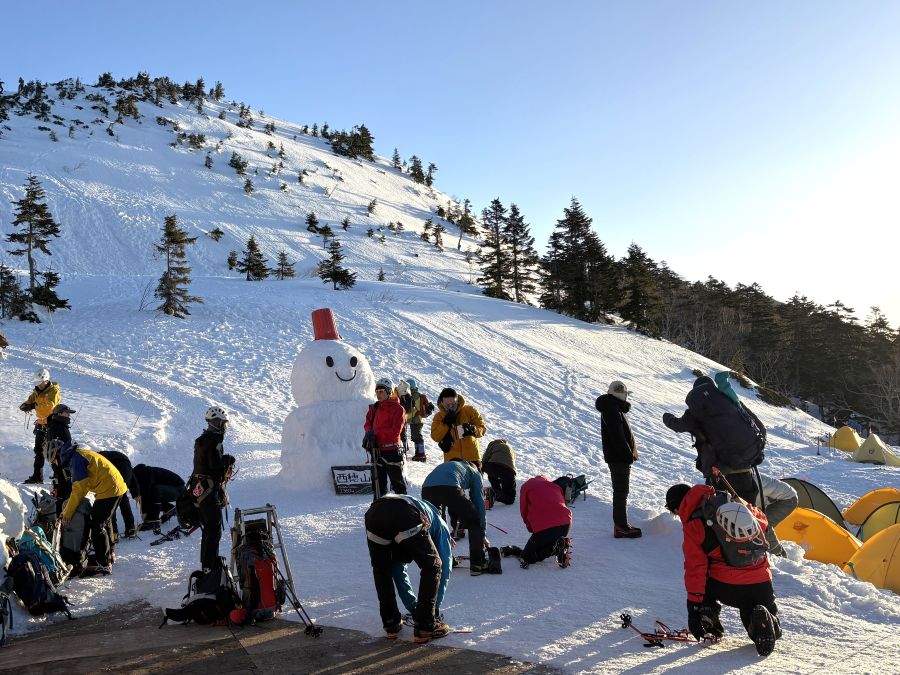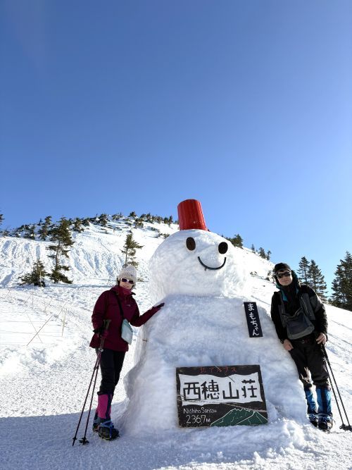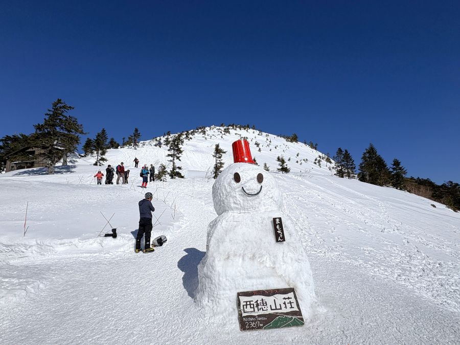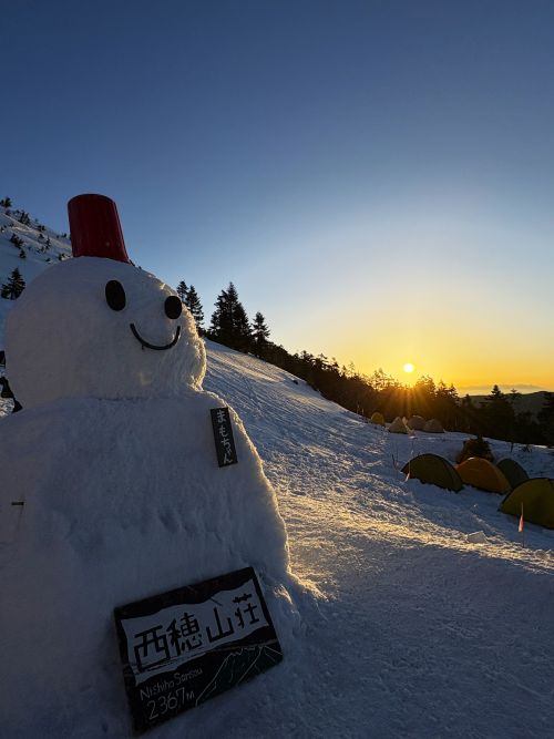 山荘前に大きな雪だるまが鎮座していました。「まもちゃん」というお名前のようです。きっと、皆を守っているから「まもちゃん」。ありがとう!こんにちは。今晩よろしくね💖まもちゃんの後ろ側、あの壁面を登って行くと、西穂丸山~西穂独標~ピラミッドピーク~西穂高山頂へと進む稜線に出るのだな。