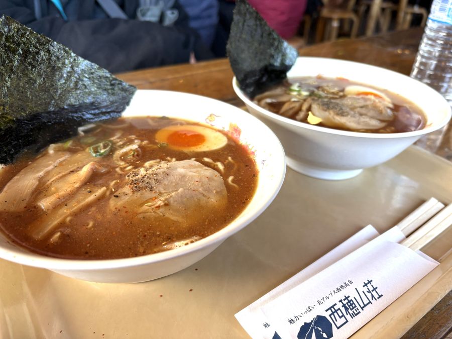到着時刻がちょうどお昼頃なので、ひとまずアイゼンを外して、まずは西穂山荘名物の「西穂ラーメン」でランチにしました。味噌と醤油があります。両方頼んで食べ比べ。私はおだしの効いた醤油が好きでした。麺はちぢれ麺。こんな高所で、水不足の中、何とありがたいことで。こってり美味しく頂きました🍜💛