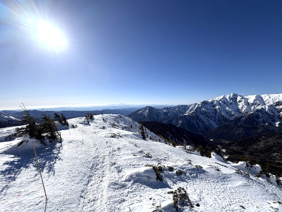 標高差数十メートル、すぐにこの稜線に出ます。ちょっと風がきついのでネックウォーマーを鼻まで引き上げて。そして、どうよ、もう、この爽快な空とアルプスの雪景色。