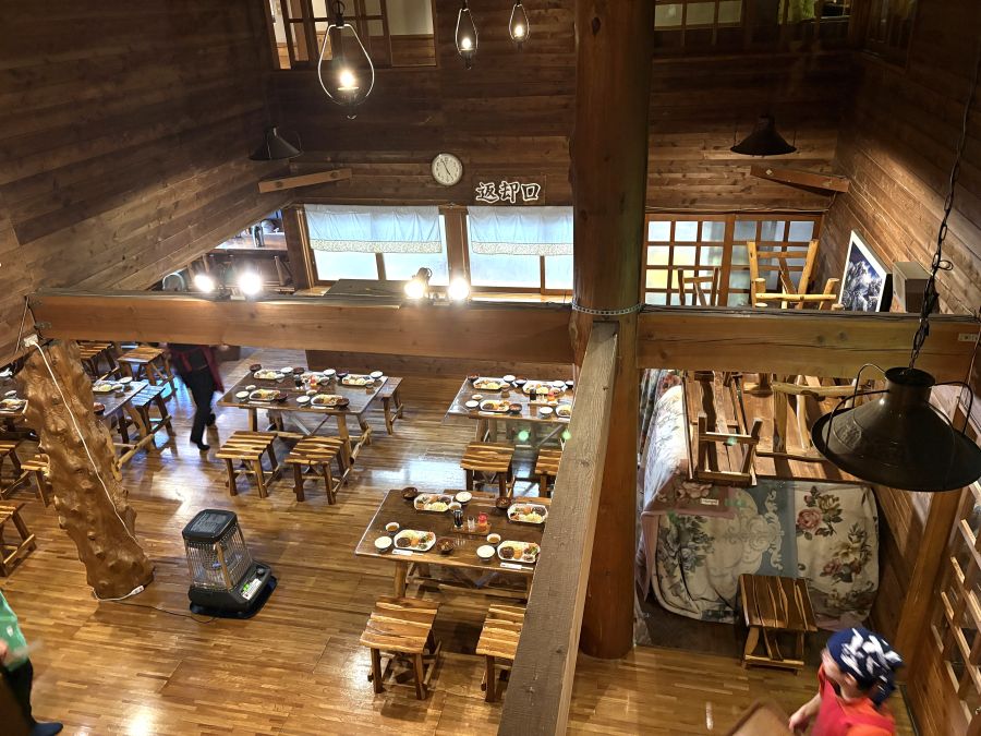 1階で靴を脱いでチェックインの手続きをすると、部屋割りと食事時刻の案内を頂きます。宿泊部屋は2階。天気の良い連休はどの部屋も相部屋でお布団がギュンギュンの満室でした。廊下には各所にストーブがたかれているので館内はとても暖か。外は氷点下でも、お布団の他に毛布も二枚ずつあり、湯たんぽも貸し出してくれるので、夜は暑いぐらいでした☺トイレは様式のバイオトイレ、冬季は洗面所の水は出ないのでペットボトルの水を買って大事に使います。