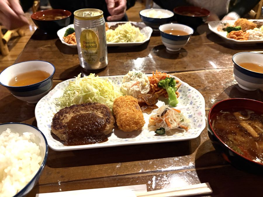 夕食はボリューム満点。とりあえず自販機で買ったハイボールも。ご飯と豚汁はお替わり自由。