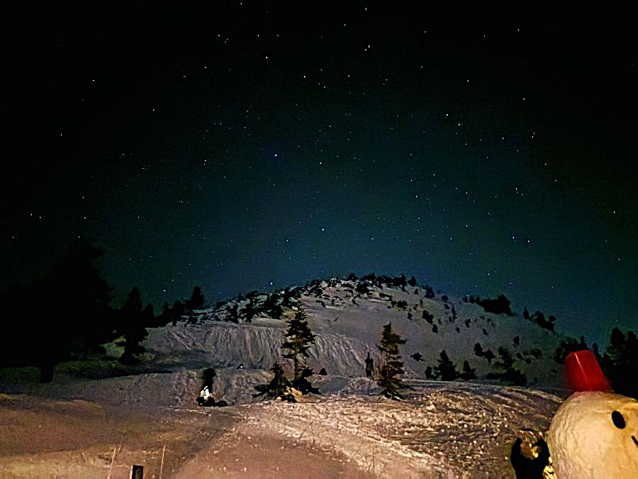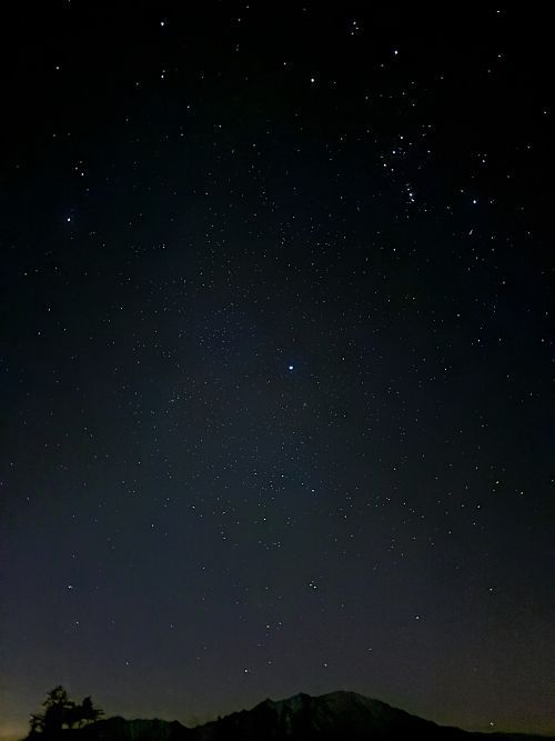 日没ショーが終わり、山荘が宇宙の一部になった頃、頭上には満点の星空が現れました。スマホの画像ではとても写りきらずに残念なのですが、本当は無数に降り注ぐような煌めく夜空なのでありました。