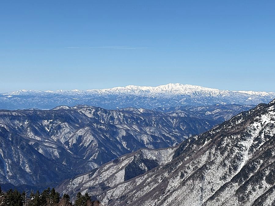 よぉ~く目を凝らすと、ちょこっと穂先を突き出しているあの尖峰は「槍ヶ岳」。